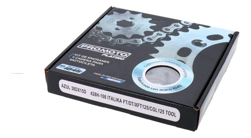 JUEGO ENGRANES PROMOTO PLATINO AZUL 38DX15D CON CADENA 428H-108L ITALIKA FT/DT/XFT125/CGL125 TOOL